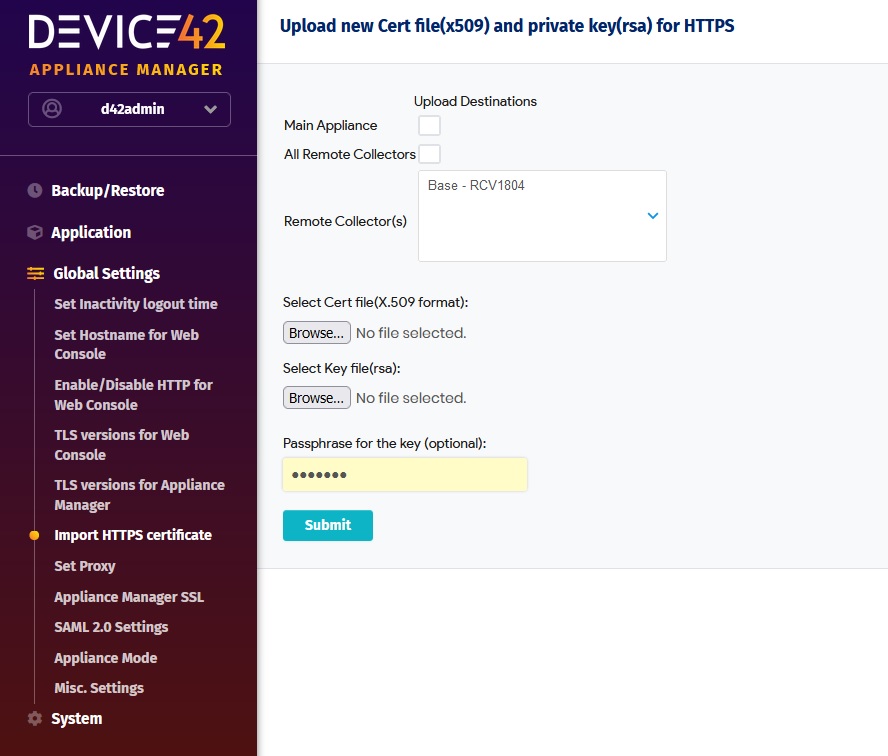 You can add your own https cert and key in apache style cert files to use a secure web console for Device42 and the Remote Collectors. You can generate a self-signed certificate with a CA using OpenSSL or Microsoft certificate server and upload it here, or you can also have one issued from a trusted certificate authority.