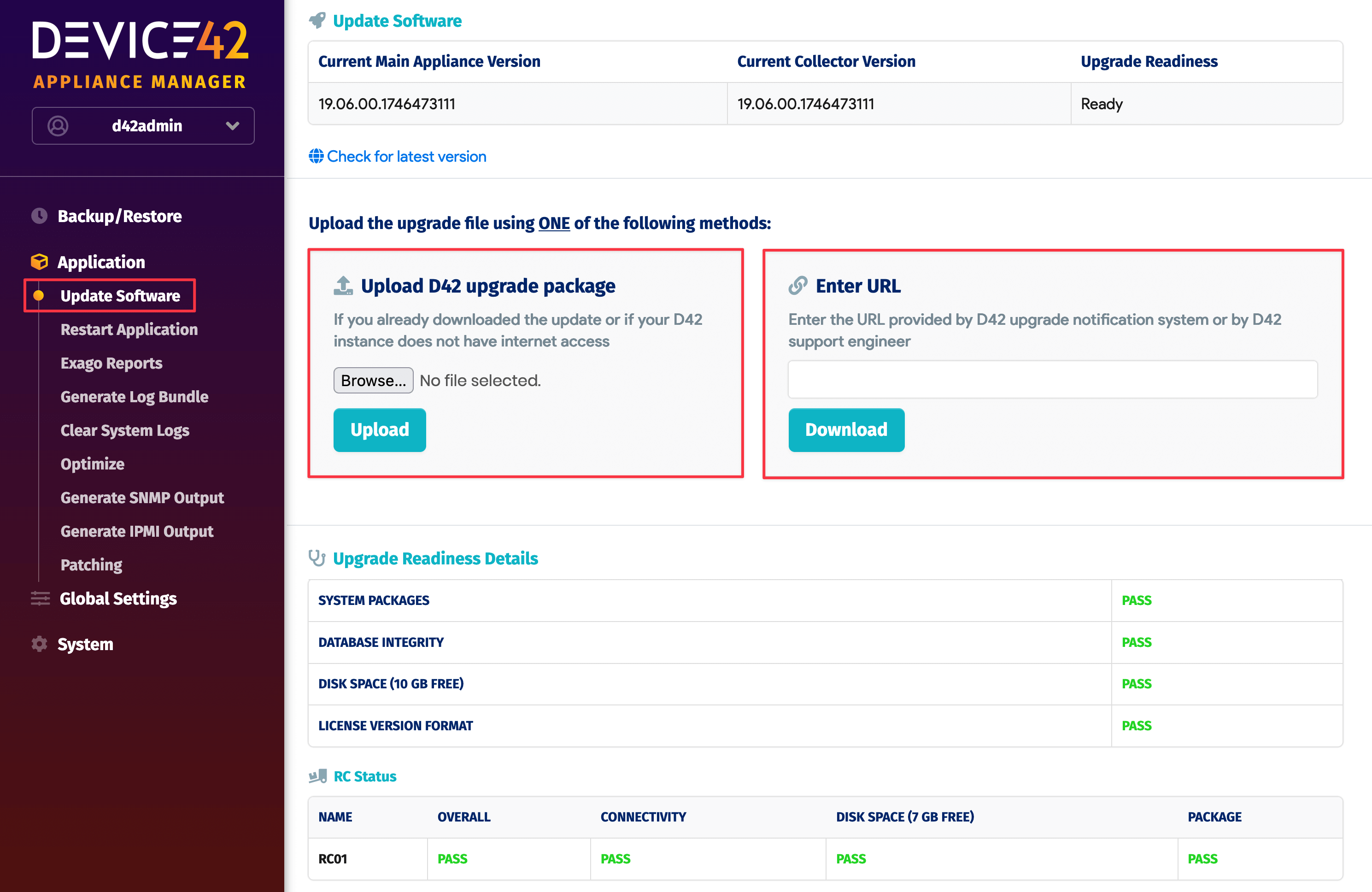 When you log in to the Appliance Manager and go to Application > Update Software, you'll see two methods for updating your Device42 Main Appliance. You only need to complete one of the options: