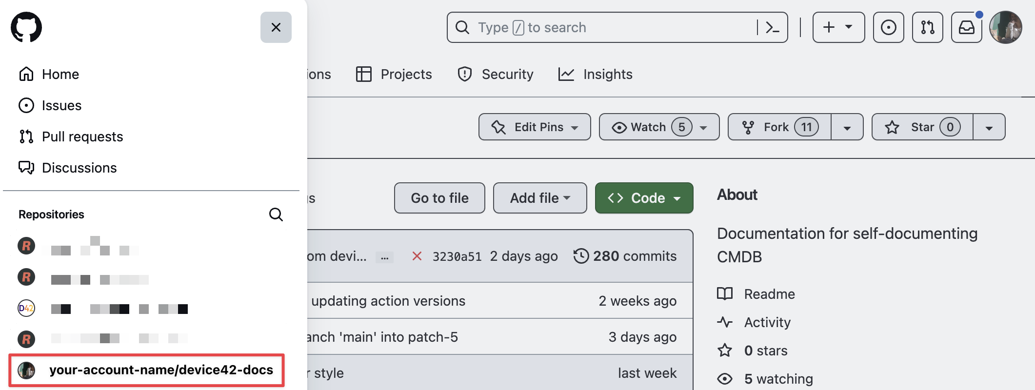 To navigate to your forked repository, click on the "hamburger" menu icon (three horizontal lines) in the top-left corner. On the panel that opens, find and select your-github-account-name/device42-docs repository from the list.