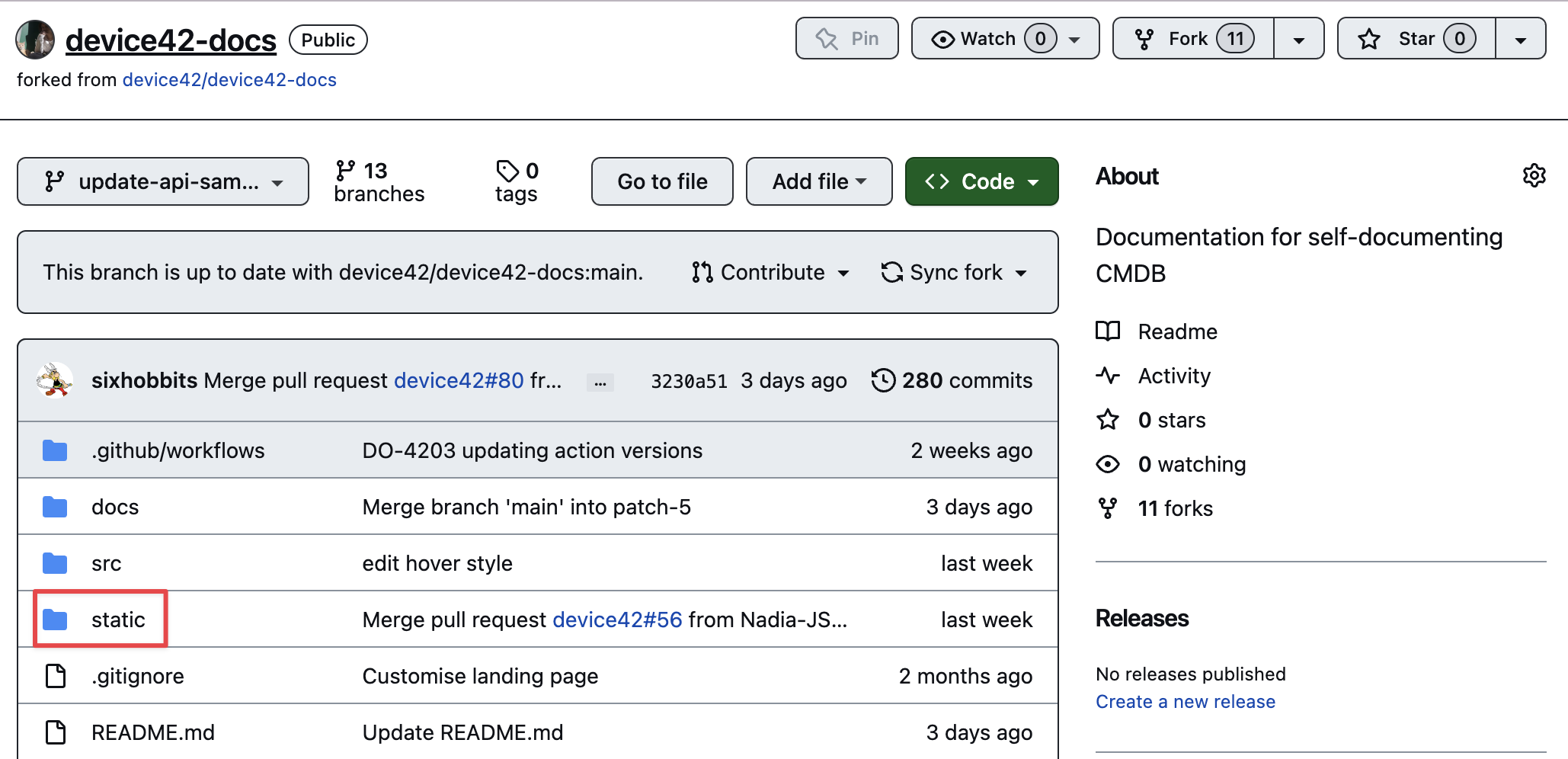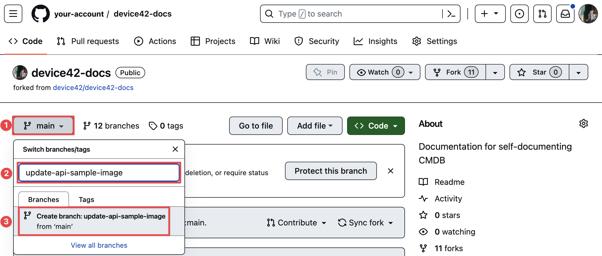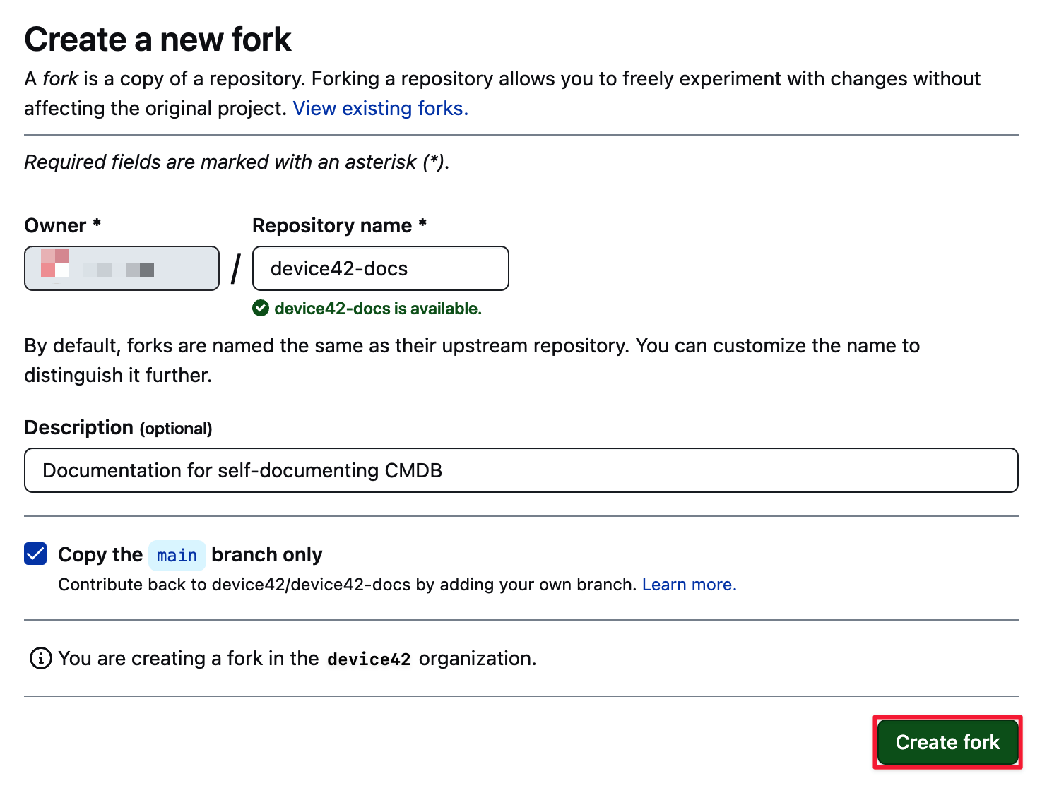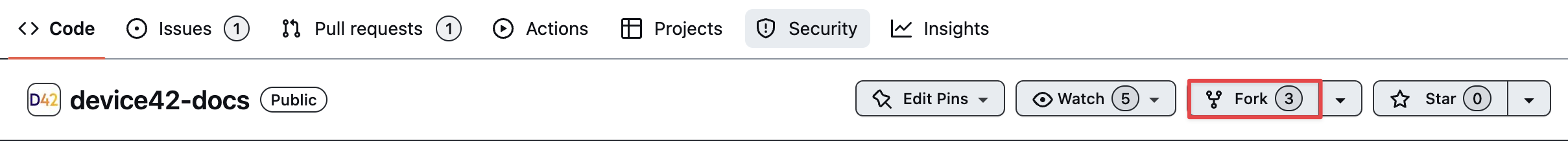 - Fork the Device42 repository OR navigate to your existing forked Device42 repository.