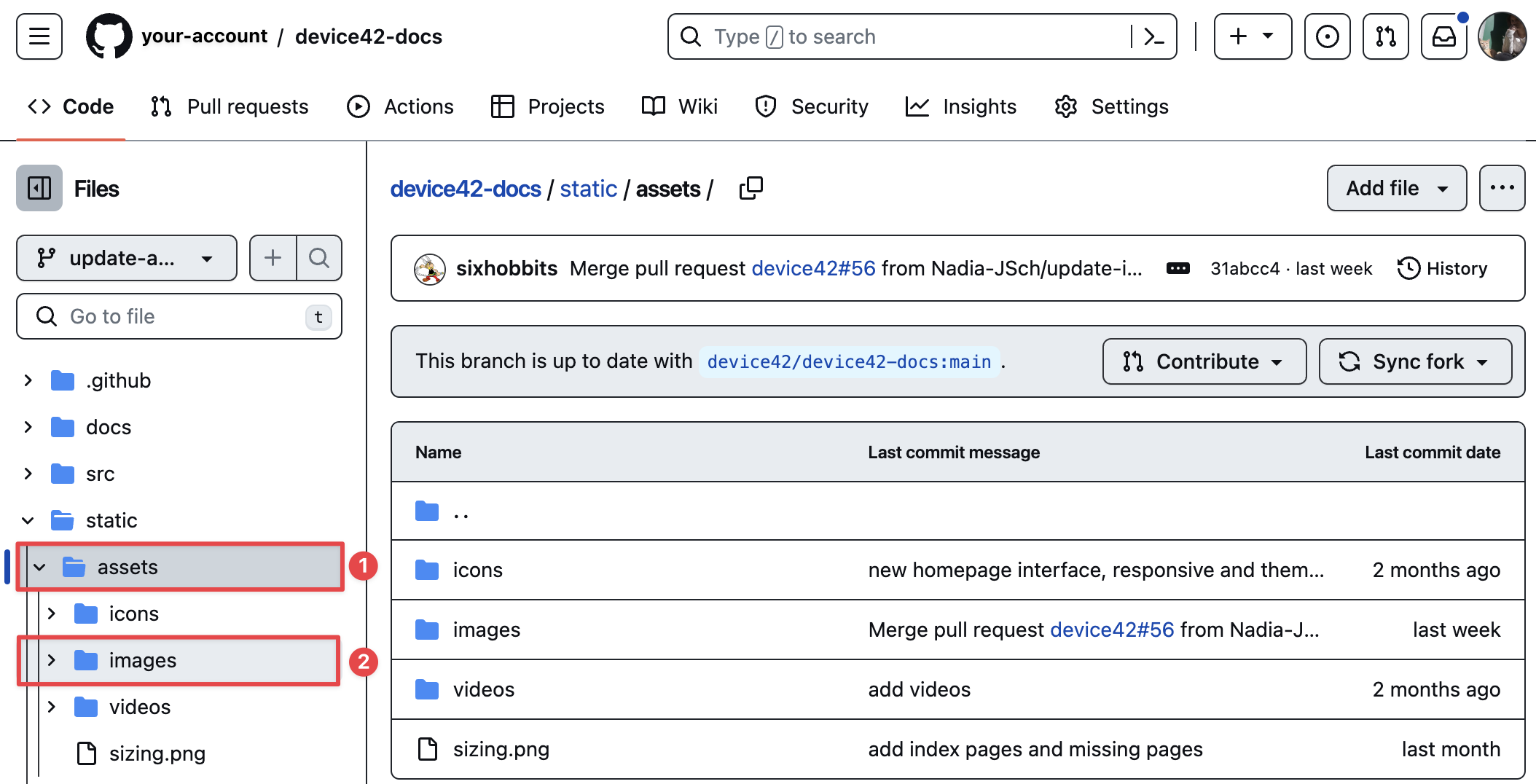 static/assets/imagesfolder and commit the change. - Change the file path in the Markdown document and commit the change.