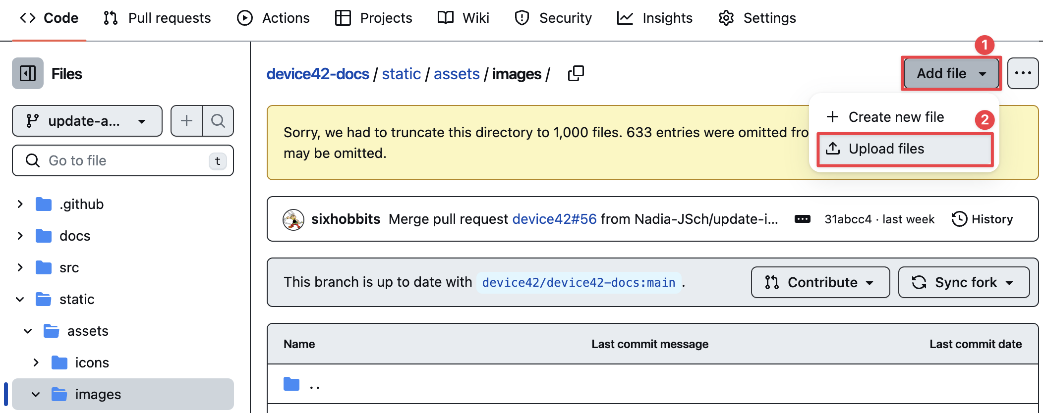 To upload your image to the images folder, click on the "Add file" dropdown menu on the right of the page (1). Select "Upload files" (2).