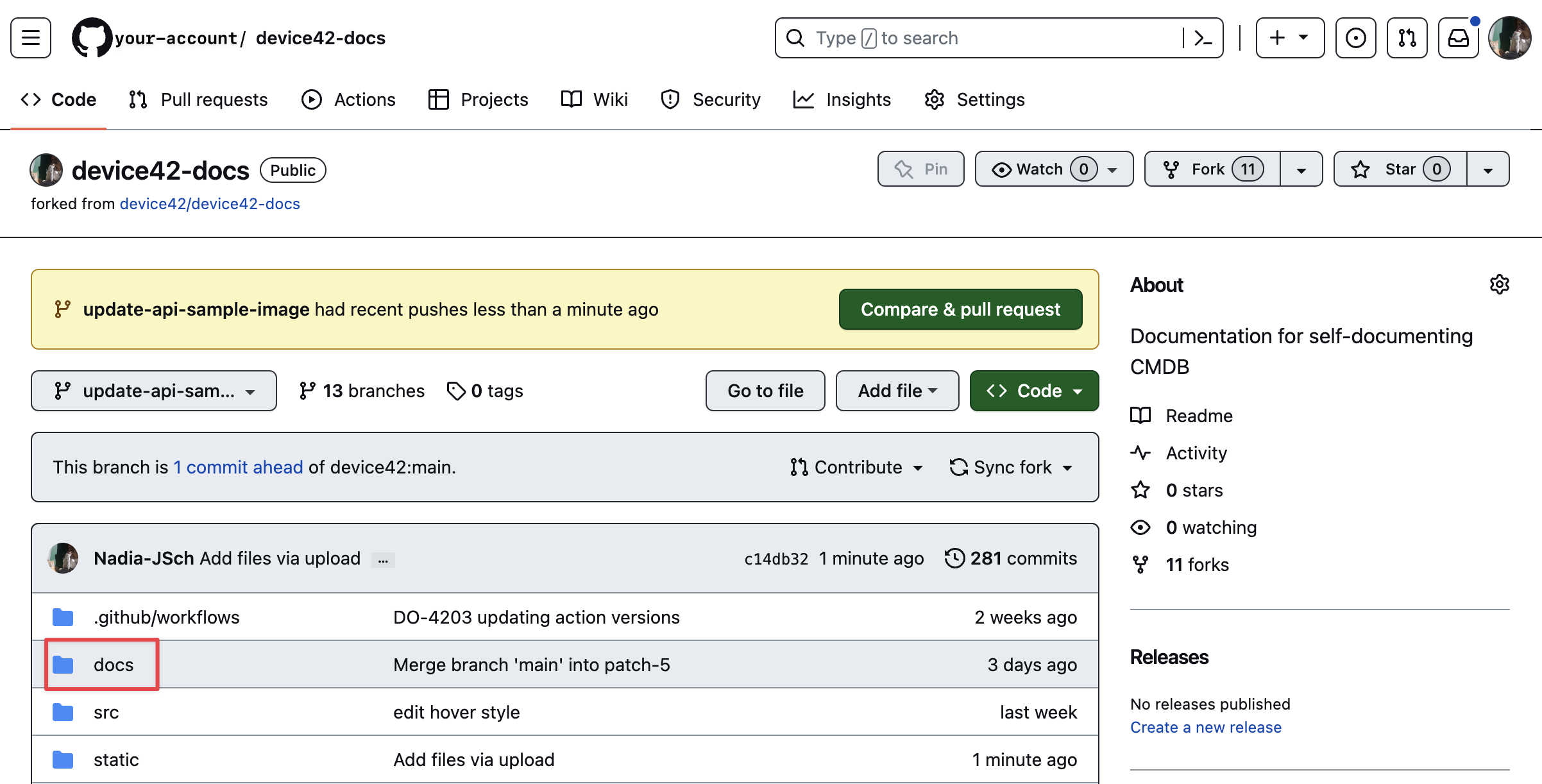 You should now see your-github-account-name / device42-docs in the top-left corner.