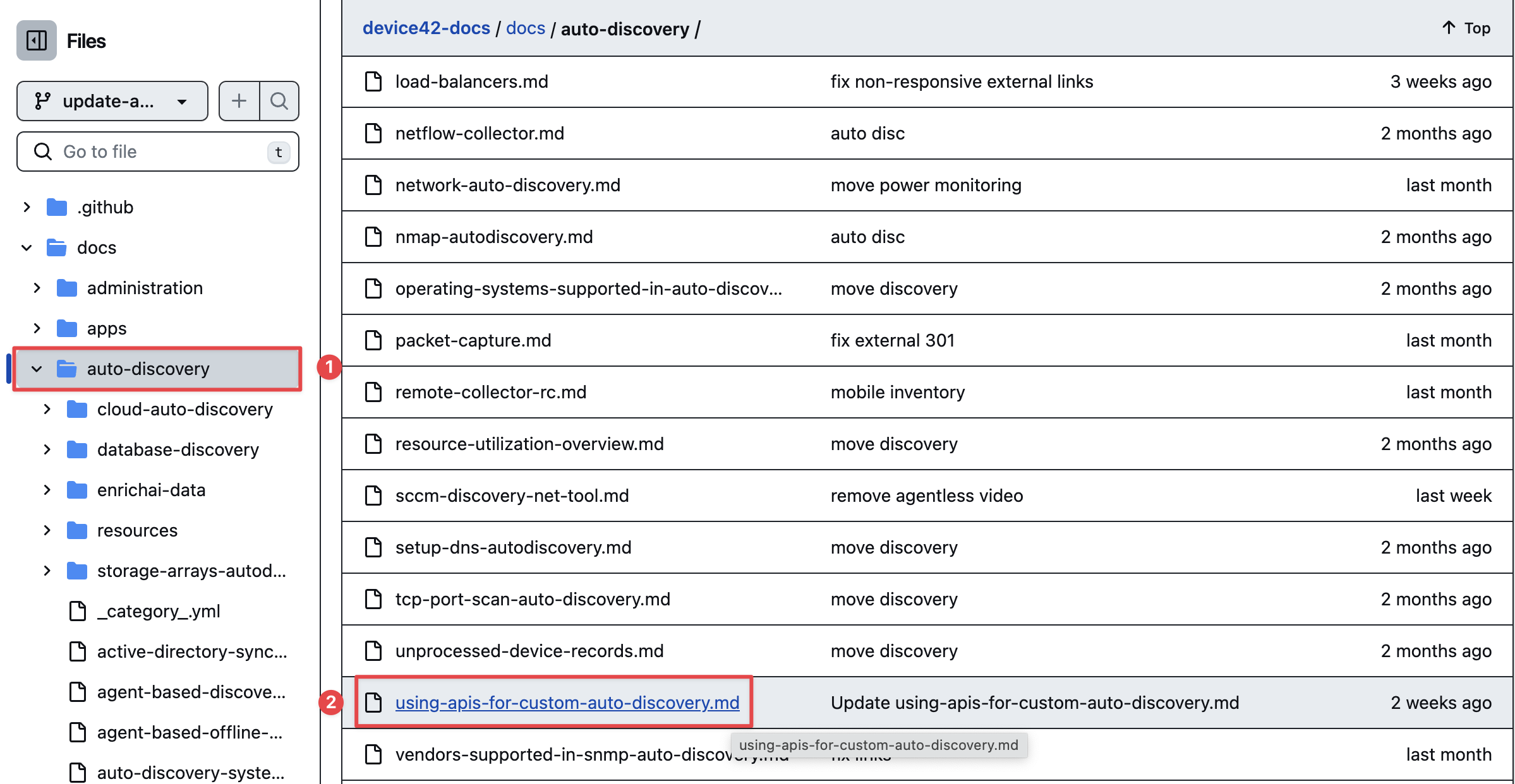 On GitHub, look for the Discovery folder in the docs parent folder. In this case, the closest match to "Discovery" is the folder named auto-discovery(2). In most cases, the folder names on the website will match those on the GitHub repository exactly.