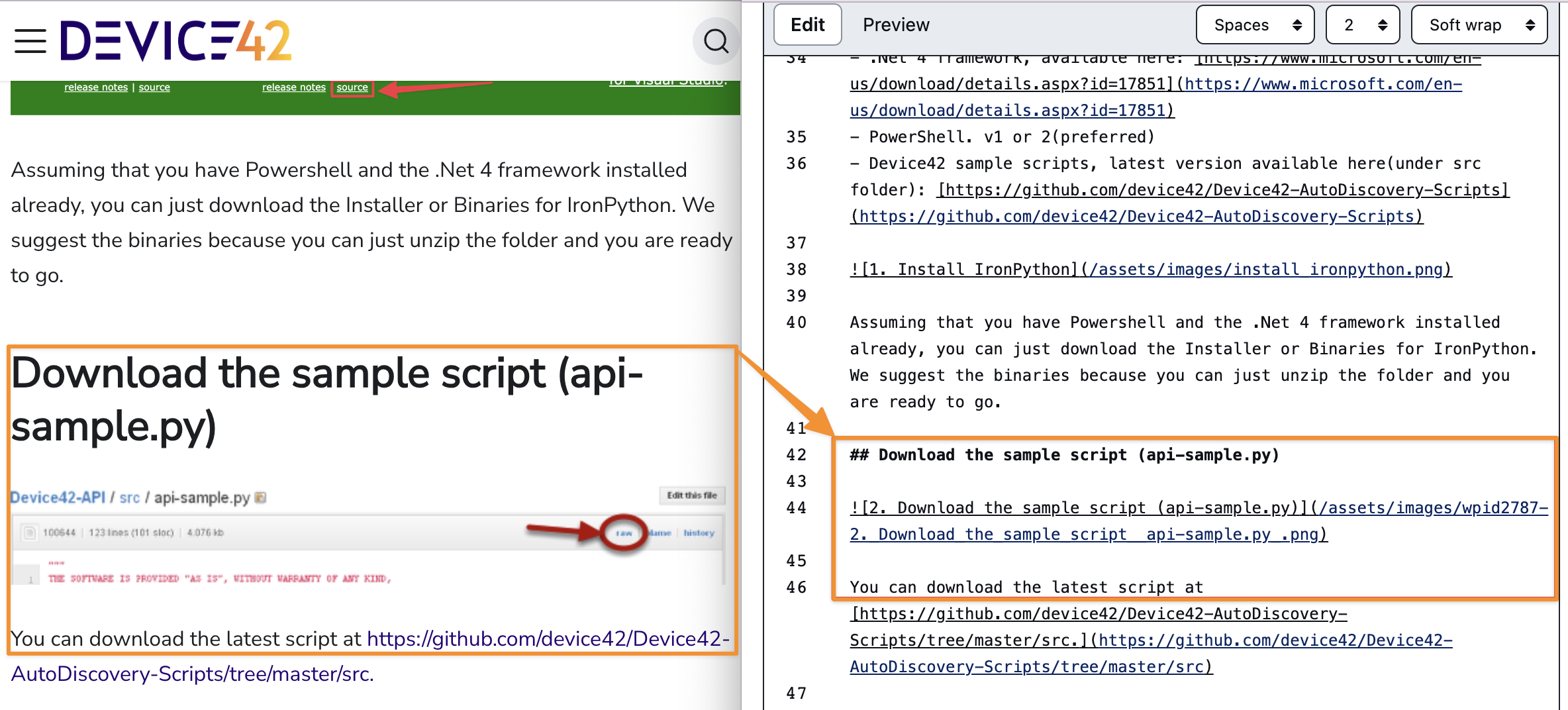 Find the link to the current image in the Markdown file by comparing the website text to the open file. In Markdown syntax, headings are denoted by one or more hash symbols. In this example, the heading "Download the Sample Script (api-sample.py)" on the website is written as ## Download the Sample Script (api-sample.py) in the Markdown file.