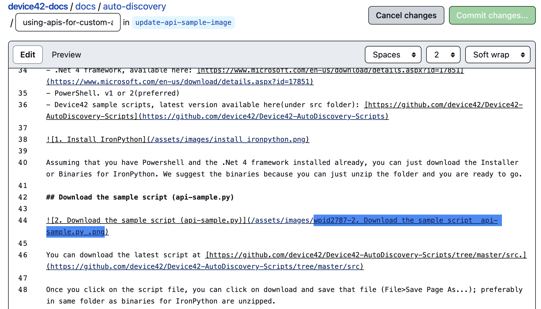 In this video, we update the IronPython screenshot on the "Using APIs for Custom Autodiscovery" page. We begin having already forked a copy of the Device42 GitHub repository.