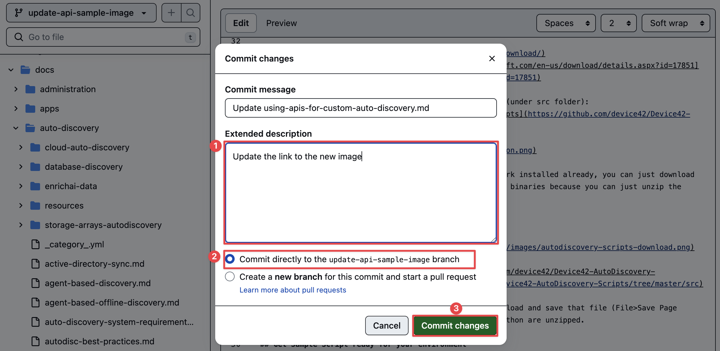 A modal window will open where we can briefly explain (1) the change we are committing to our update-api-sample-image branch. Keep the "Commit directly to the update-api-sample-image branch" option selected (2) and click the "Commit changes" button (3).