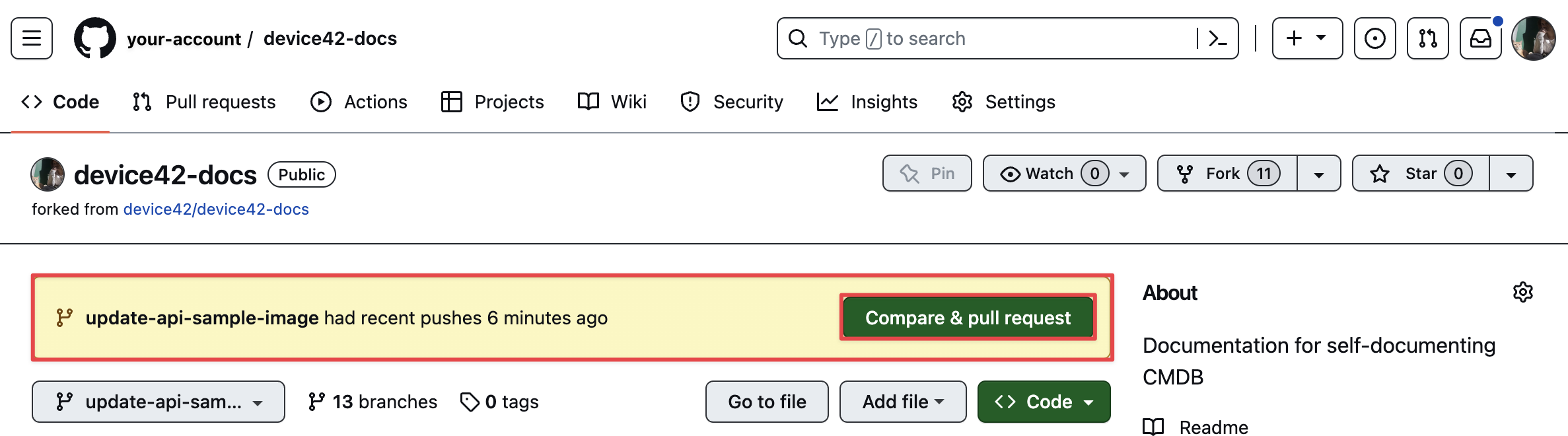 We'll now create a pull request to submit both of the changes we made. You'll see the yellow notification box with a message saying your branch "had recent pushes". In this example, the notification is "update-api-sample-image had recent pushes 6 minutes ago".