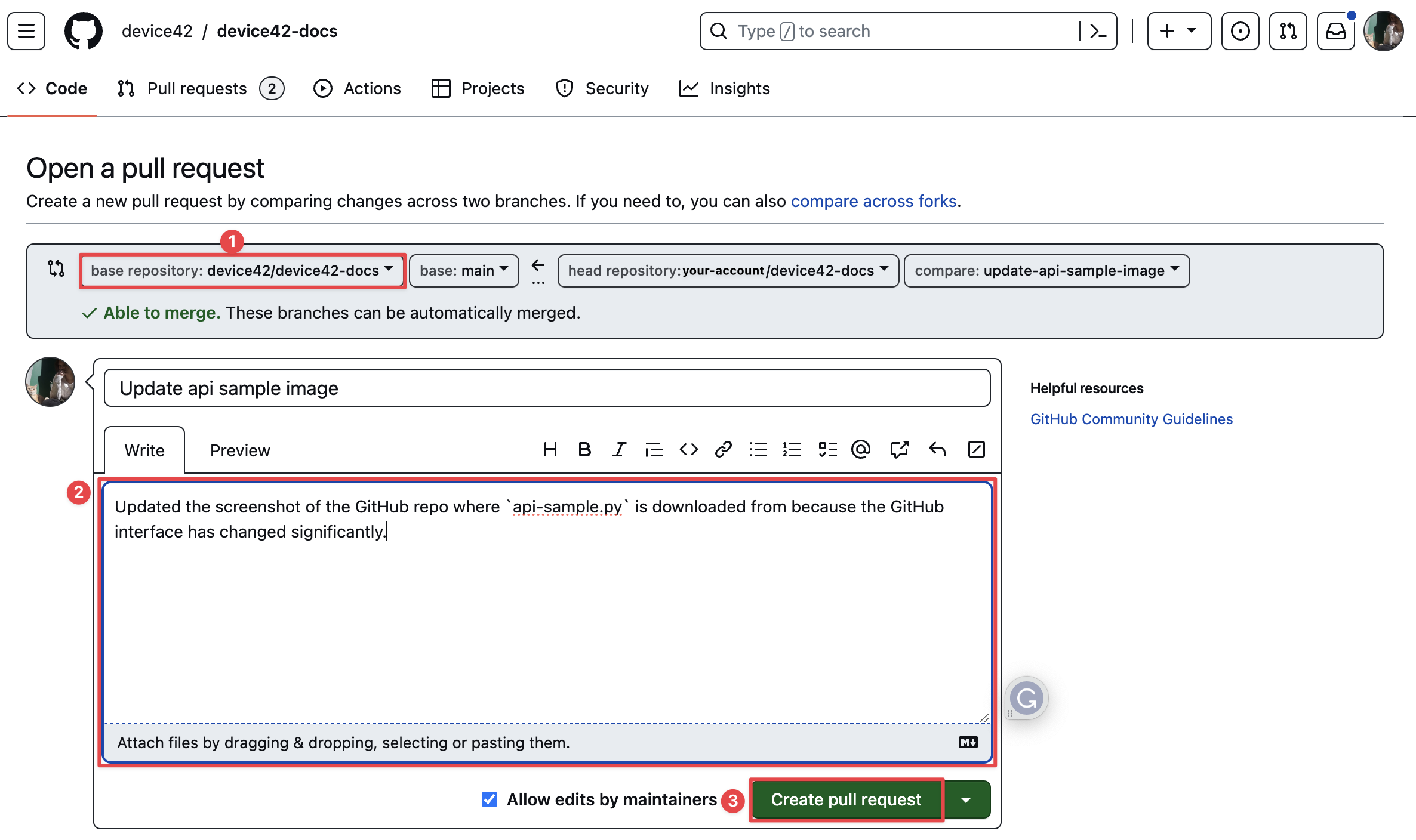 The "Open a pull request" page will open. Double-check that the base repository is device42-device42-docs (1). The base repository is where we're submitting the changes we made to our forked repository (called the "head repository").