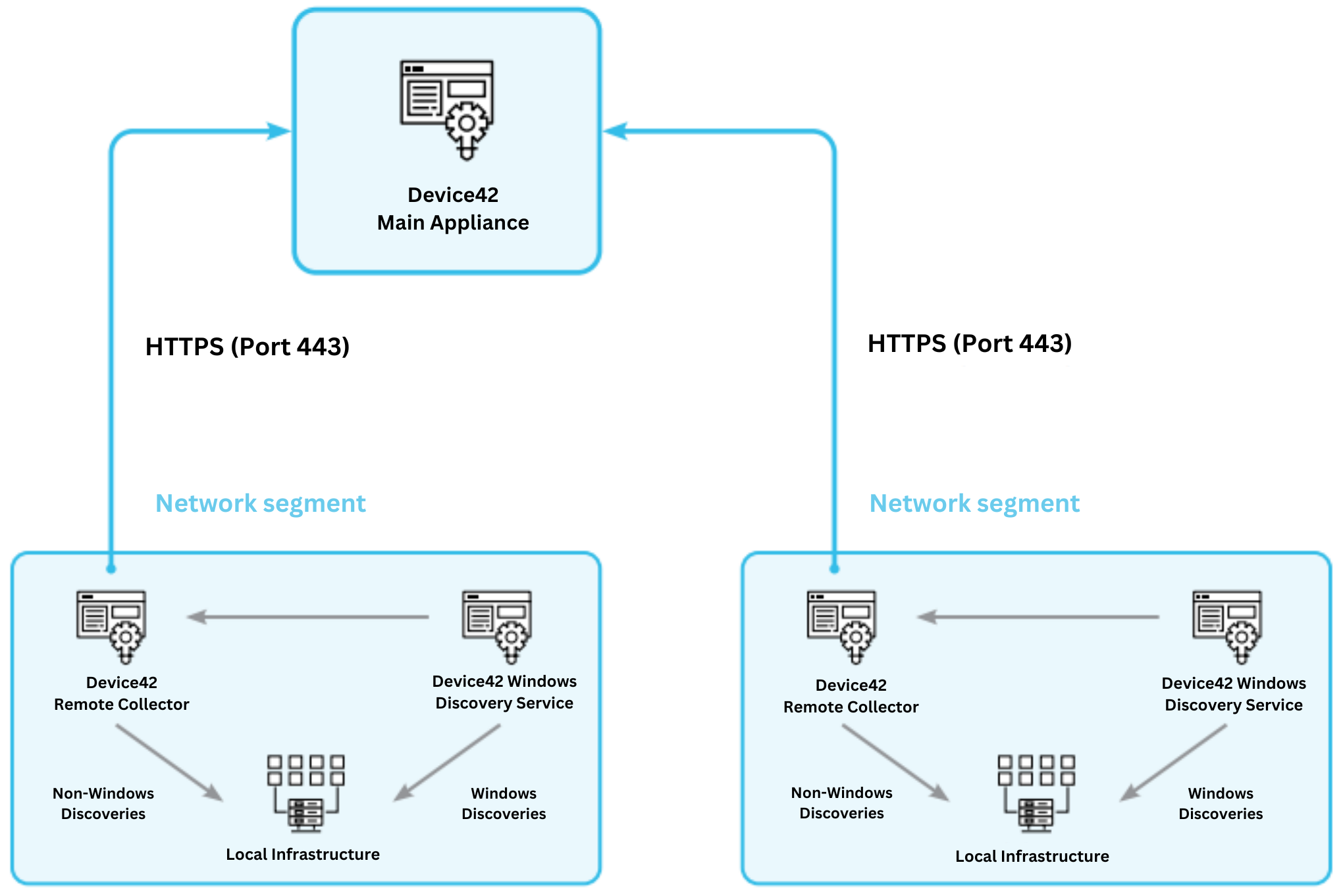 Device42 is deployed in a hub-and-spoke architecture; each RC/WDS collects data and syncs it back to the centralized MA. It is typically recommended for RCs and WDS instances to be deployed in pairs, if Windows discovery is required.