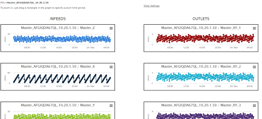 Here you can see the last 24 hours of power data for each infeed and outlet for each PDU in the rack. If you want to look at a different time (for example, the last week, month, or year), click the Show Settings button.