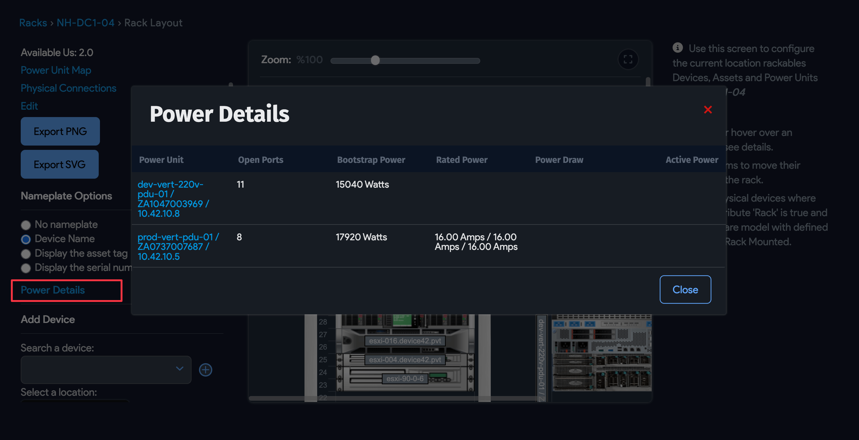 The PDU watts sum will also be visible on the rack layout page as shown below. Click Power Details in the left pane to see the PDU power details.