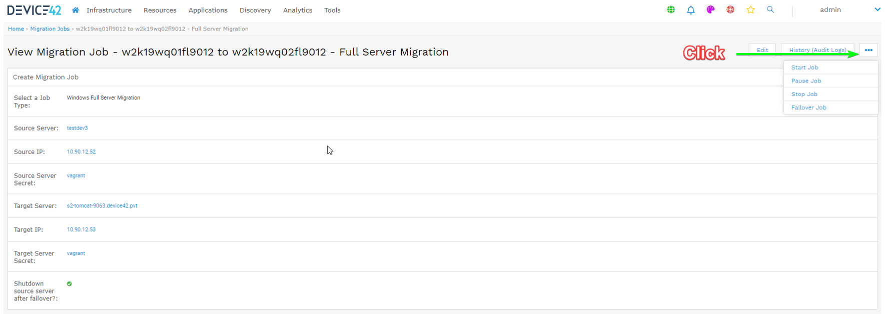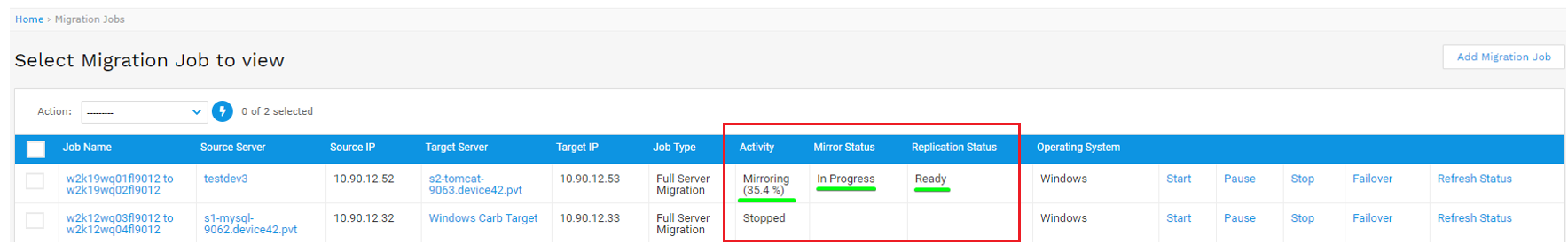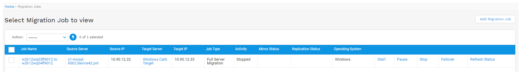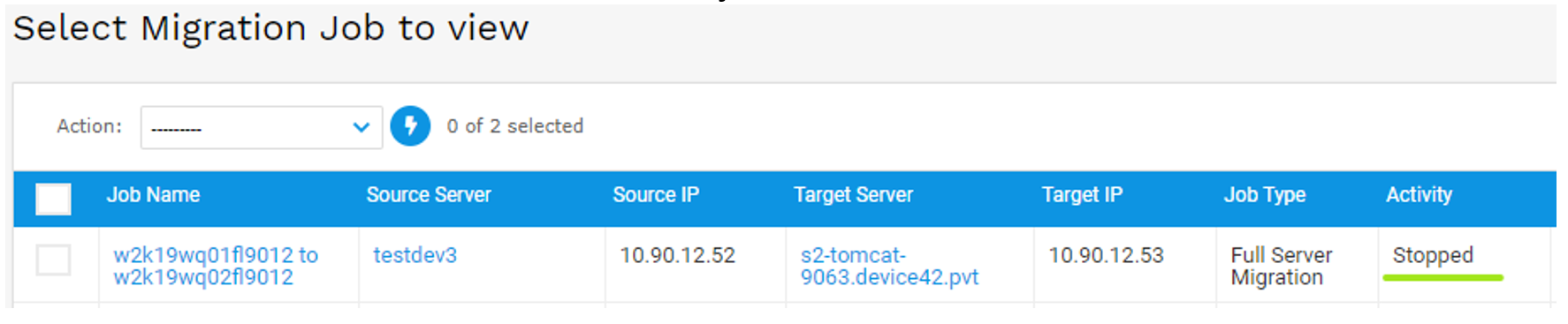 - After selecting the action, go back to the Migrate Jobs list page and the status of the job should be updated. If there’s a delay between your D42 machine and your target server, click the Refresh Status link to refresh the job status.