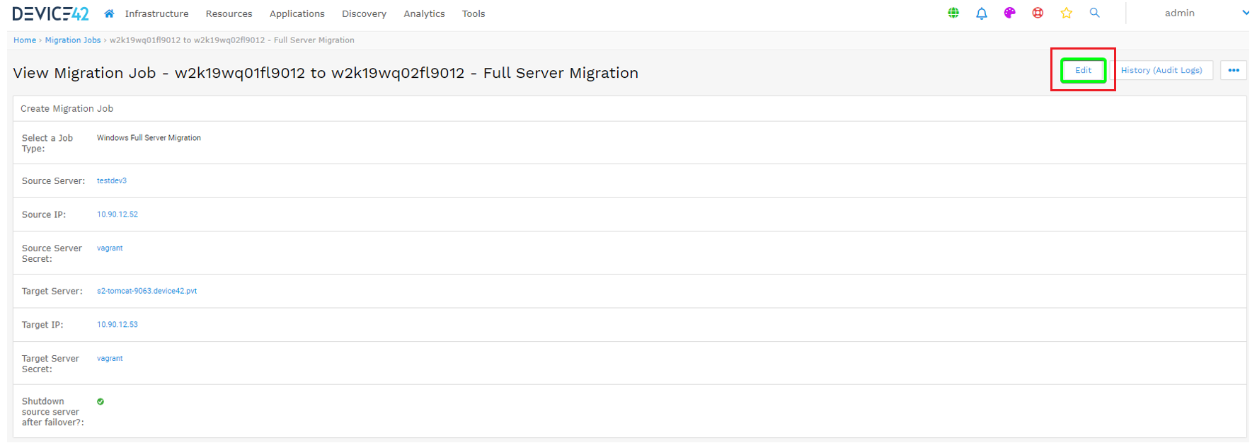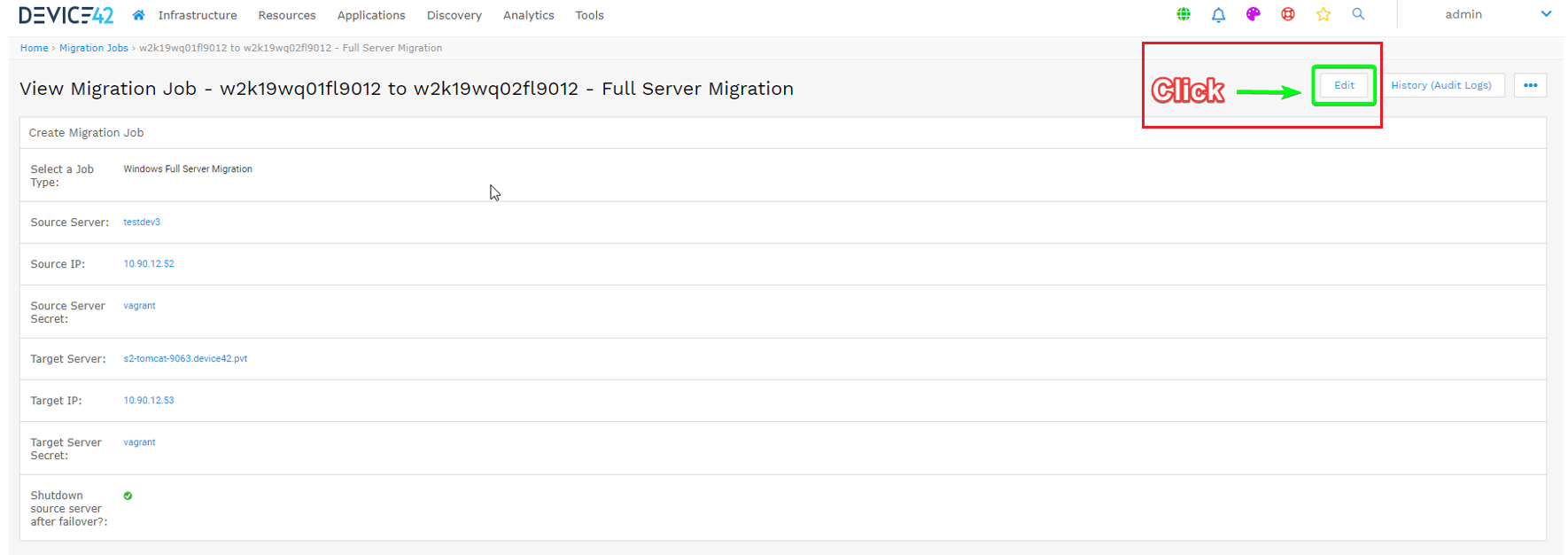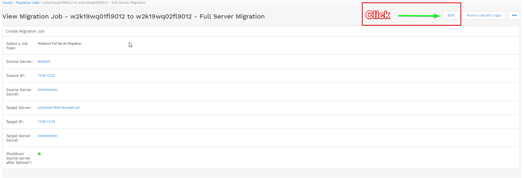 - Begin by clicking the job name you want to edit on the job list page and click Edit button on the View Migration Job page that follows.