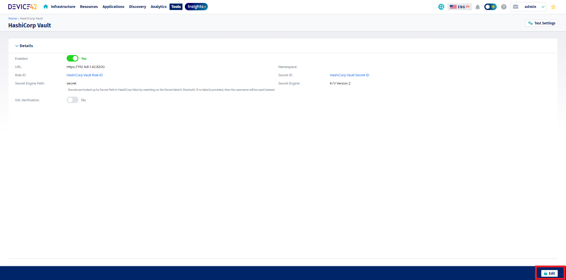 - Click on the Edit button in the bottom right corner and enter your HashiCorp Vault RESTful API information. (Example below)