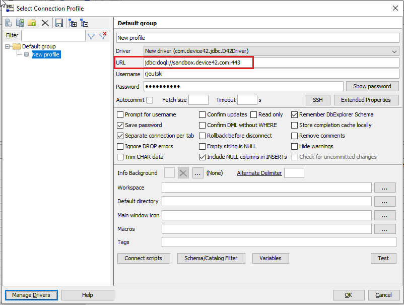 - Create a new profile using the created driver with a URL such as jdbc:doql://sandbox.device42.com:443 (port 443) and your credentials to your Device42 instance. Replace sandbox.device42.com with your Device42 instance.